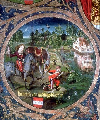 Der Babenberger Herzog Heinrich von Mödling, der Jüngere (bis 1236) vor dem Babenberger Wasserschloss Laxenburg bei Wien