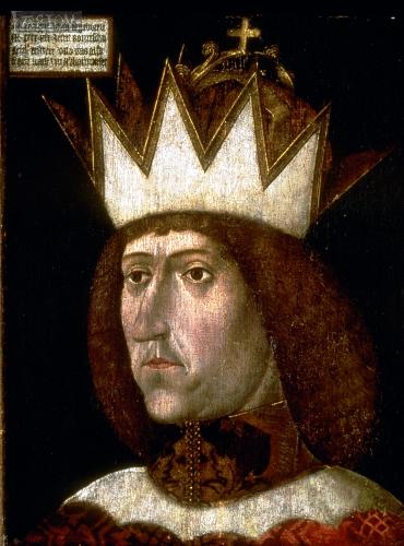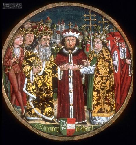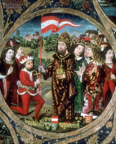Der Babenberger Habsburger Kaiser Friedrich III. (V., 1415-1493); mit der gleichen Kleidung und Strahlenkronenfassung wie Leopold VI. zeigt er sich offen als Babenberger | |