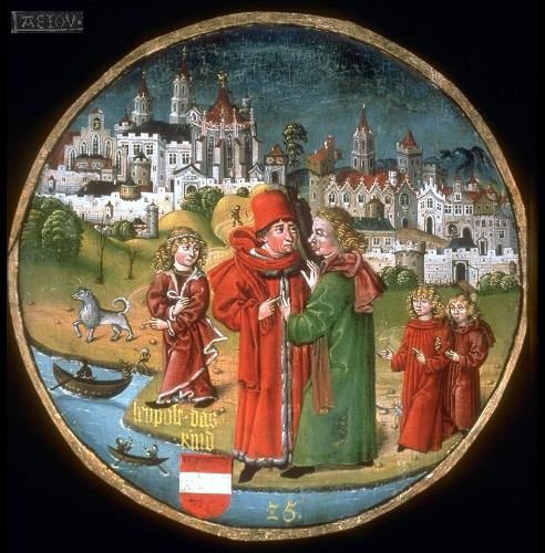 Der Babenberger "Leopold, das Kind", Sohn von Herzog Leopold VI. vor dem Stift und der Stadt Klosterneuburg